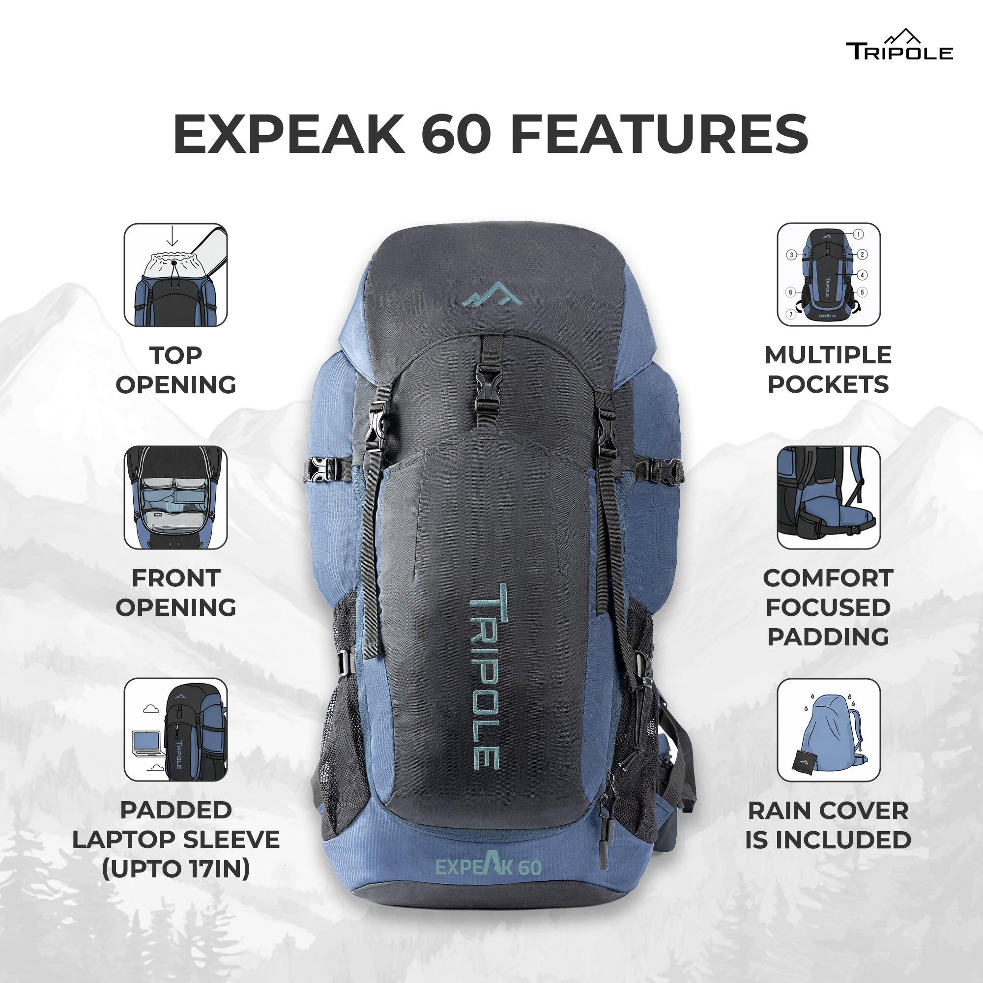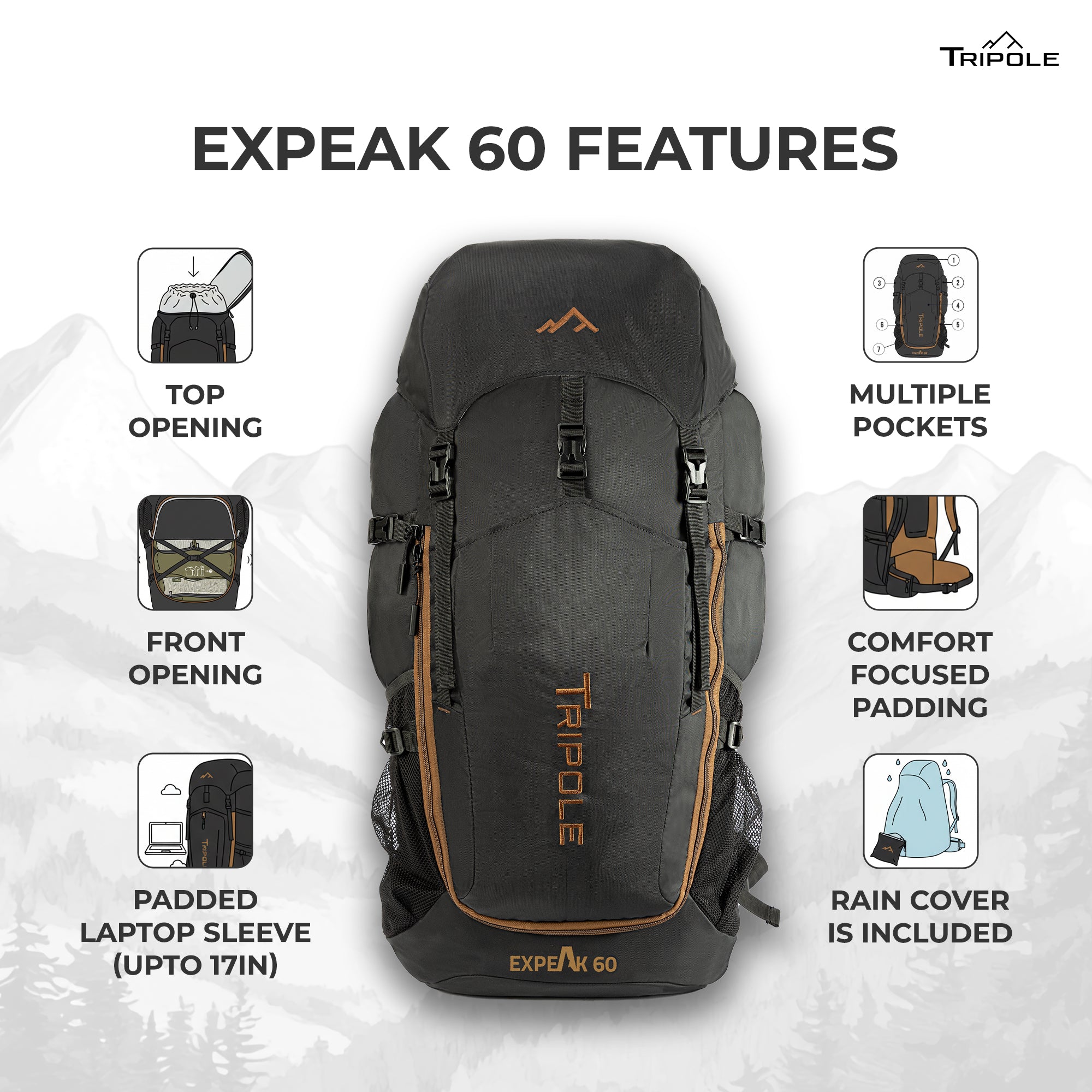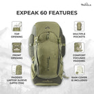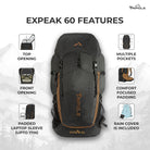 Tripole Expeak 60L Rucksack Bag for Men & Women | Front Opening, Laptop Compartment & Raincover | Trekking, Hiking & Backpacking